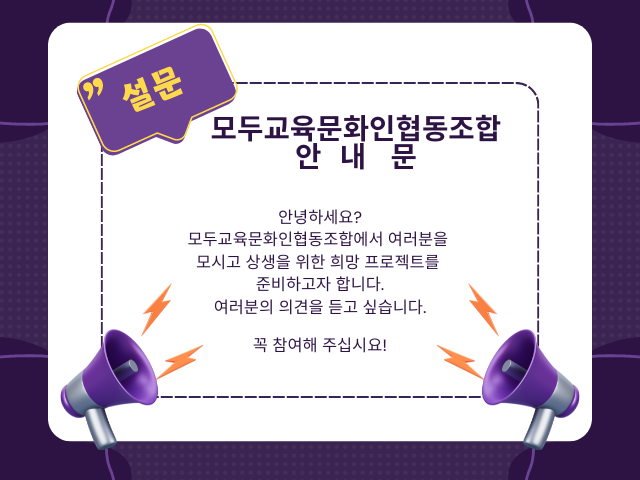 안녕하세요? 모두함께와 함께 해주셔서 감사합니다. 하지만 기대에 부응하지 못해 대단히 죄송합니다. 이제 교육조합에서도 그 동안의 침체를 극복하고 조합원과 함께 할 수 있는 활기 차고 의미있는 활동을 하고자 합니다. 이에 앞서 조합원님들의 의견을 듣고 싶습니다. 번거롭더 라도 설문에 응답해 주시면 조합 발전에 큰 힘이 될것입니다.