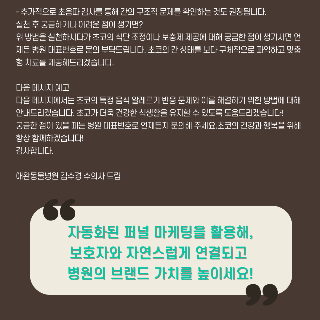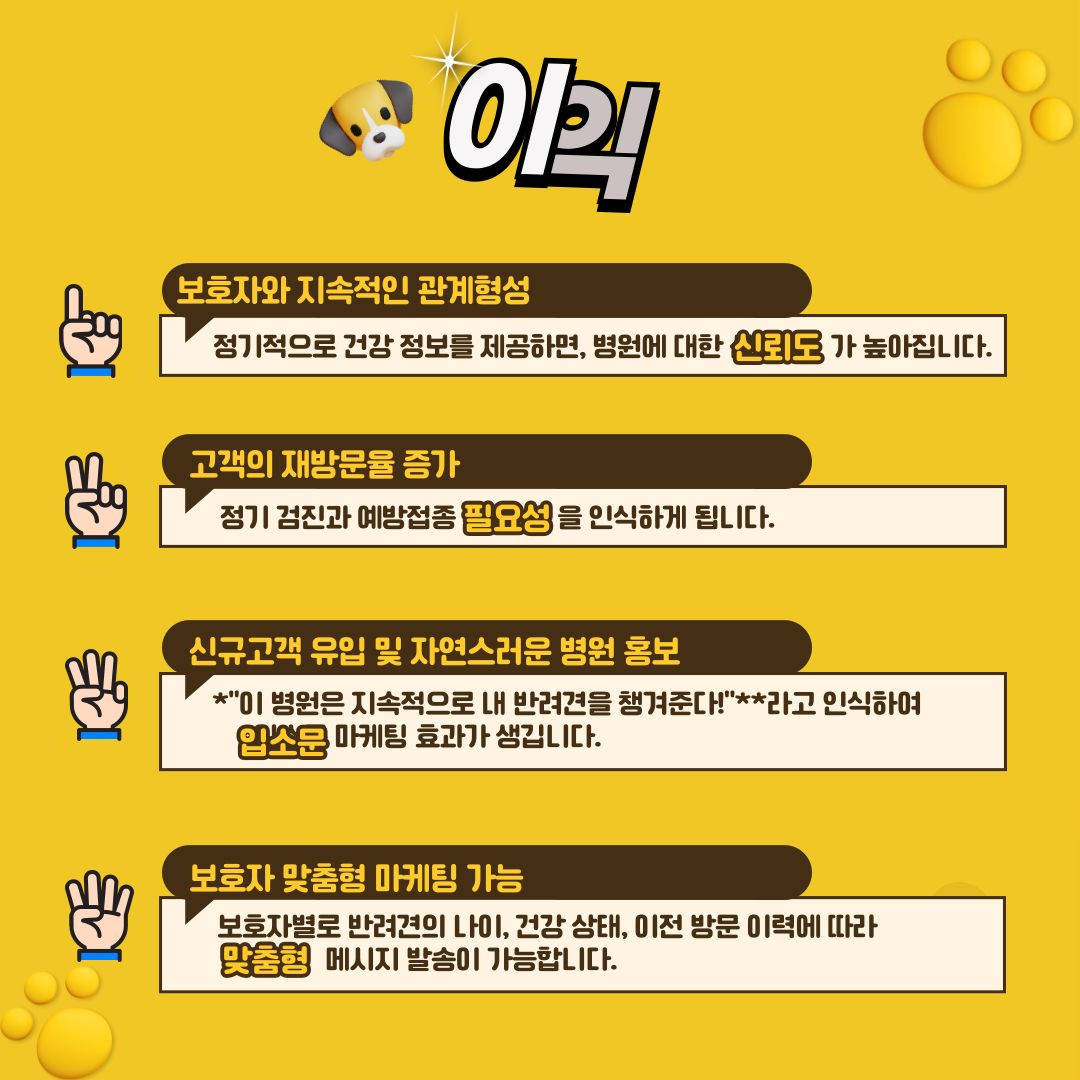 사랑하는 반려견 보호자들에게 정기적인 건강 정보를 제공하고, 병원의 단골 고객으로 만들 수 있는 기회! 보호자들이 메시지를 받으면, 자연스럽게 병원 방문을 고려하게 됩니다.